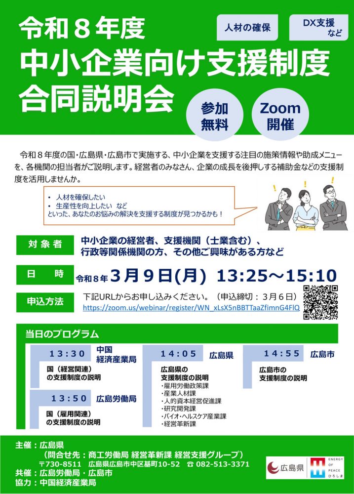 令和8年度に国・広島県・広島市で実施する、中小企業を支援する注目の施策情報や助成のメニューを、各機関の担当者がご説明します。経営者のみなさん、企業の成長を後押しする補助金などの支援制度を活用しませんか。なお、令和8年度予算の成立を前提にしていることから、今後、その内容が変更になる可能性もありますので、あらかじめご了承ください。