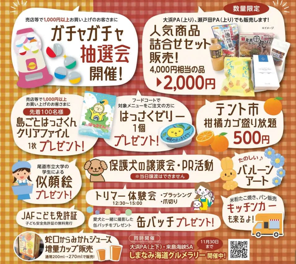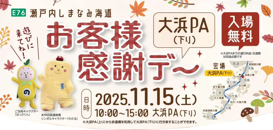 | 協力 | 広島県道路公社、一般社団法人日本自動車連毎中国本部、因島商工会議所、ピースわんこジャパン 福山譲渡センター |