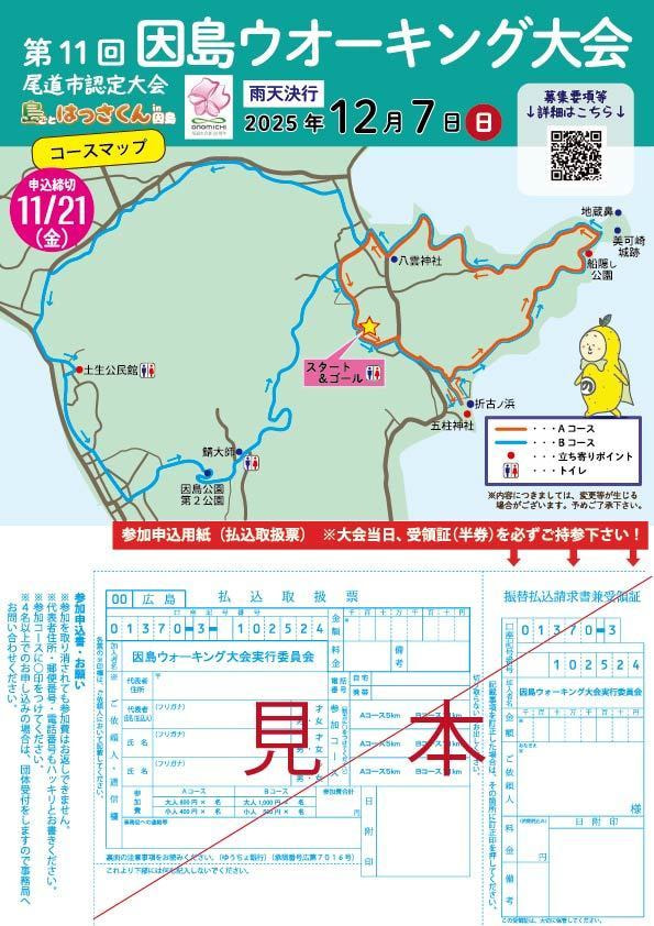 | 主催 | 因島ウォーキング大会実行委員会 尾道市・因島商工会議所・(一社)因島観光協会・広島県ウォーキング協会・因島地区区長連合会・NPO法人しまなみスポーツクラブ・因島やまびこ会・尾道市スポーツ推進委員協議会因島ブロック・因島交通安全協会 |