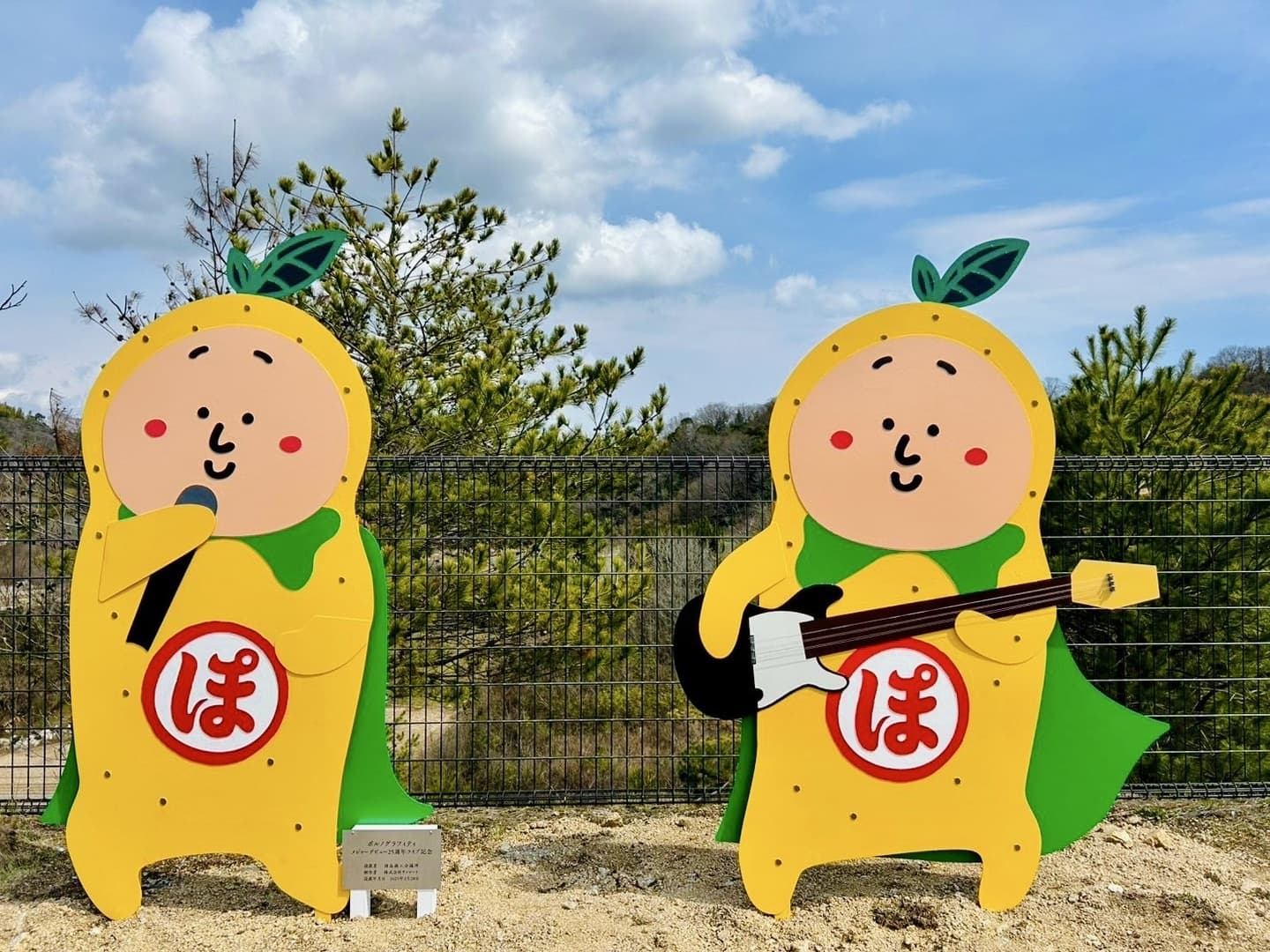 「はっさくんのモニュメント」は、ポルノグラフィティのお二人と「はっさくんのテーマ」を歌ってくれた因島高校の生徒さんたちと一緒に、ライブ後に記念撮影をした場所にあります。