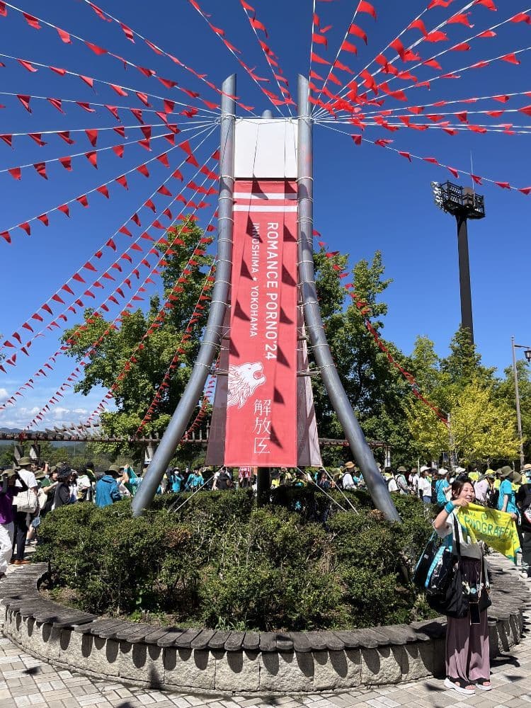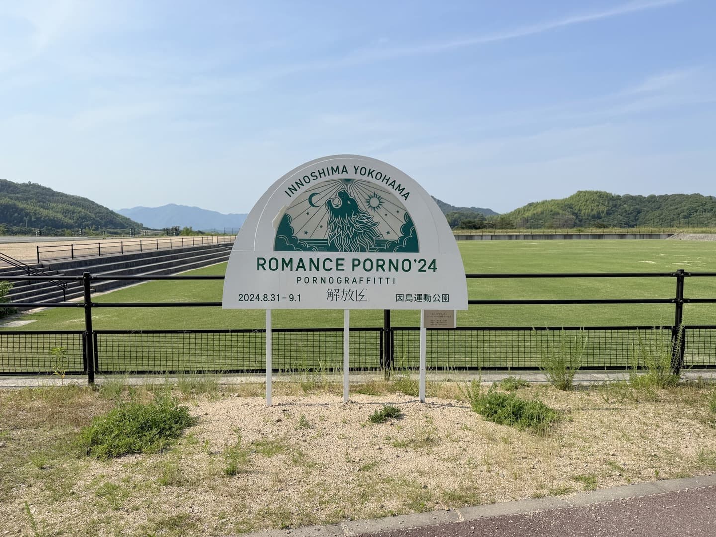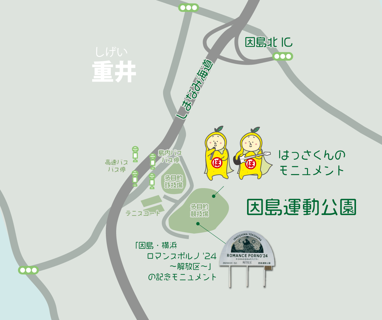 因島運動公園には、ポルノグラフィティさんメジャーデビュー25周年を記念して開催された「因島・横浜ロマンスポルノ'24 ~解放区~」の記念モニュメントと「はっさくんのモニュメント」が設置されています。