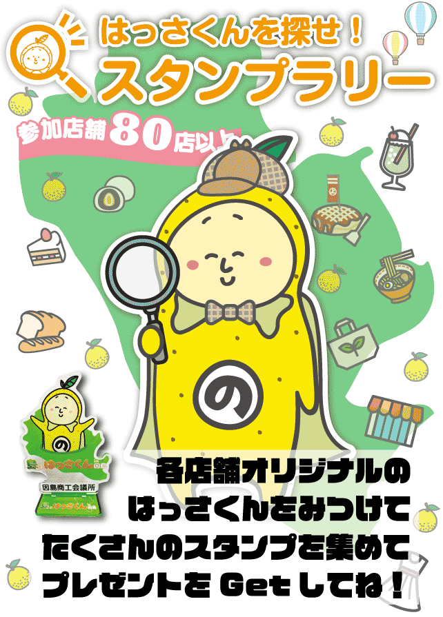 スタンプ台紙は、スタンプラリー参加店舗(はっさくんのアクリルスタンドがあるお店)で配布しています。お店でそれぞれ違うはっさくんを探してください!